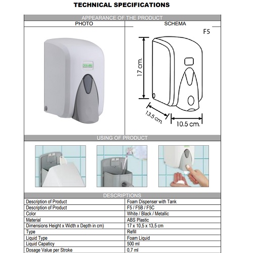 Vialli držač za sapun u PJENI 500ml bijeli dispenzer sa spremnikom F5. Zidni dozatori za sapun u PJENI sa spremnikom i spremnikom za nadoljevanje pjene zapremine 500ml Vialli (foam dispansers with tank). Praktičan zidni dispenzer kapaciteta 500 ml, namijenjen za stvaranje pjenastog sapuna. Izrađen od kvalitetne plastike, moderan i jednostavan za održavanje. Idealno rješenje za sanitarne prostore u uredima, školama, ugostiteljstvu i kućanstvu. Vialli dozator za pjenu visoke je kvalitete, namijenjen za dugogodišnje korištenje i sa mogučnošću lakog čišćenja samog tijela pumpice. Odličanog ergonomskog dizajna predstavlja idealno rješenje za doziranje sapuna u PJENI u svim radnim režimima. Dozator za sapun u PJENI ima moderan dizajn koji se uklapa u svaki interijer. Dispenzer pjenastog sapuna izrađen je od kvalitetnog materijala i jednostavan je za korištenje. Tekući sapun u PJENI se u samo tjelo dozatora za pjenasti sapun direktno nadoljeva (toči) u za to predviđenu posudu spremnik (tank). Tank – rezervar je ugrađen i fiksan u samom dozatoru za pjenu (dakle NE koristi izmjenjive refil uloške već se sapun u PJENI u dozator nadopunjuje uljeva u spremnik iz npr. kanistera).