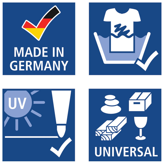 - primjena moguća na gotovo svim površinama (staklu, koži, tekstilu, kamenu, metalu, drvu i plastici)