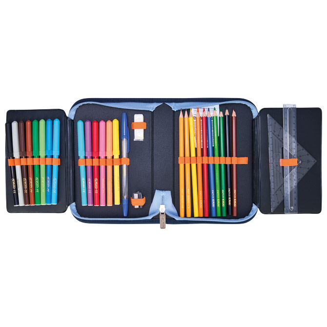 - punjena s 31 komadom pribora: Flomaster školski 14 boja, boje drvene 8 boja, olovka grafitna HB x 2 komada, šiljilo, gumica, ravnalo pvc, trokut, olovka kemijska